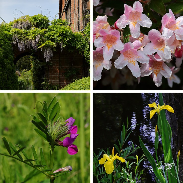 Formal and informal, clockwise from top left: wisteria on an arch beside the house, abelia growing beside a lawn, irises along the wilder edges of the canal, a vetch in a wildflower area.